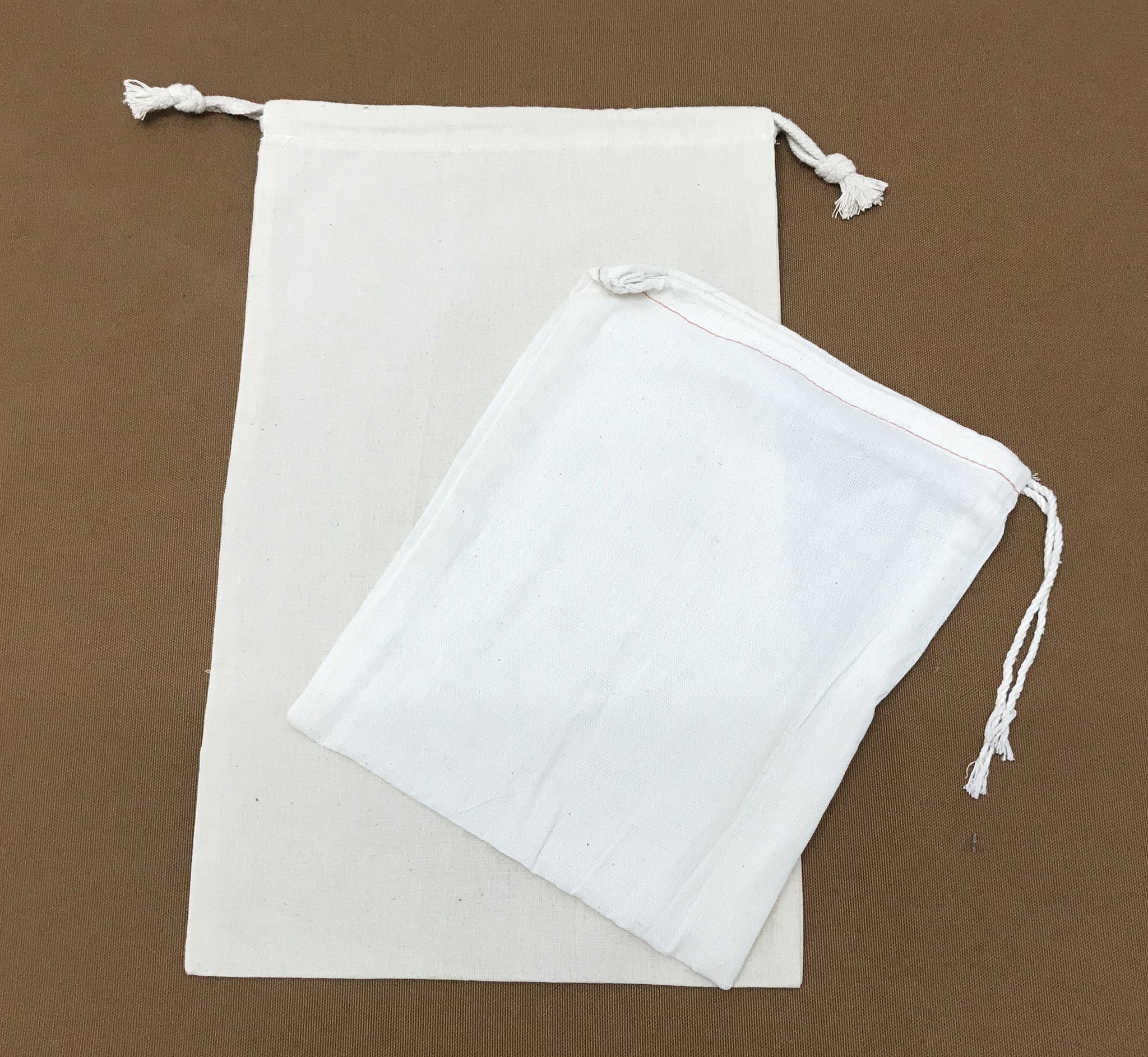 9" x 15" bag is an unbleached cotton muslin w/ double knotted cord.