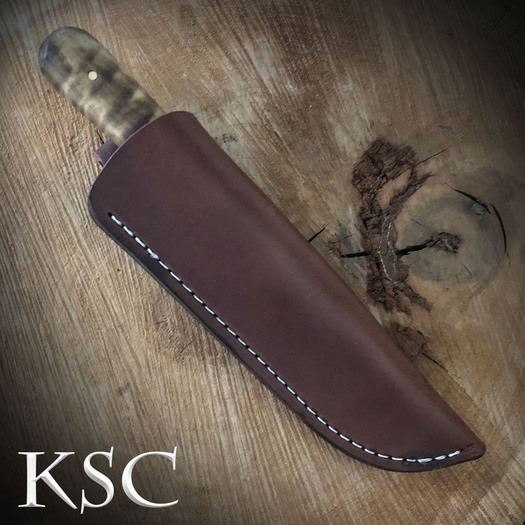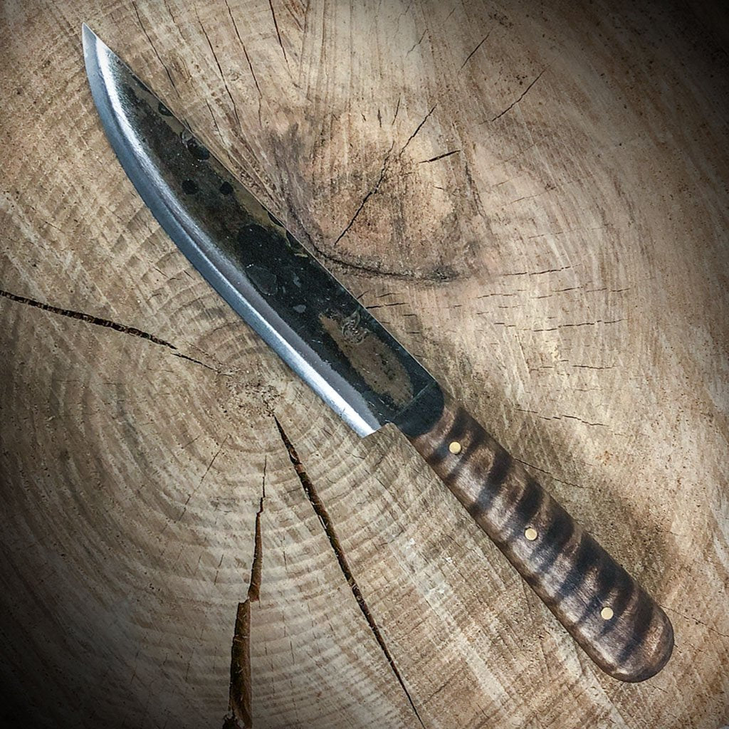 - Nicely figured, hand-finished curly maple handle secured with two brass pins