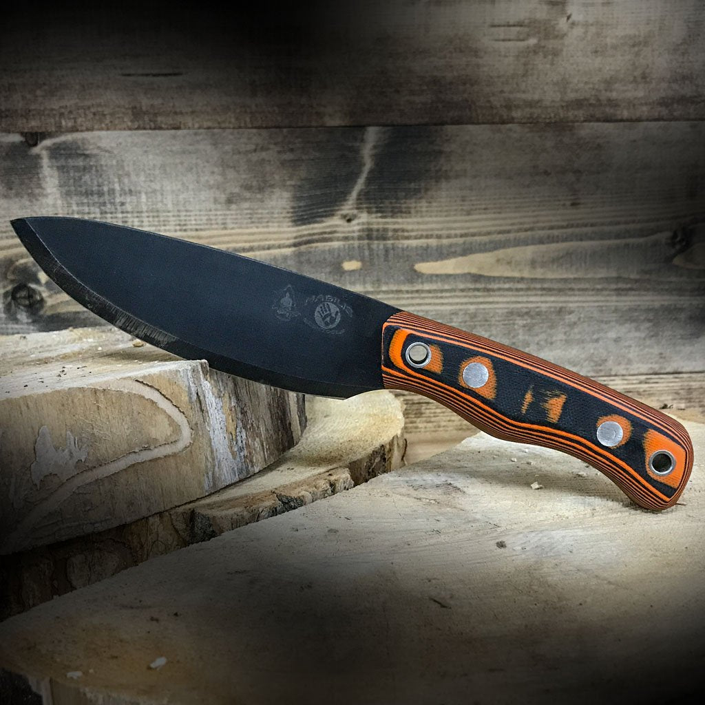 1095 High Carbon Steel, with a 1/8" thick blade measuring 5" and an overall length of 9 1/2". Comes with a G-10 handle available in Tiger (orange). It has a Scandi grind. Also, the center hole in the handle allows you to use that as a bearing block in bow drill set up. DON'T MISS OUT ON THIS GREAT CUSTOM KNIFE...GET YOURS TODAY!